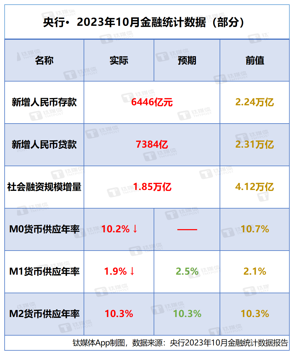 钛媒体App 11月13日消息,央行2023年10月金融数据报告出炉,其中,10月份社会融资规模增量为1.85万亿元,比上年同期多9108亿元;10月份人民币贷款增加7384亿元,同比多增1058亿元。10月末,广义货币(M2)同比增长10.3%,增速与上月末持平;狭义货币(M1)同比增长1.9%,增速分别比上月末和上年同期低0.2个和3.9个百分点。