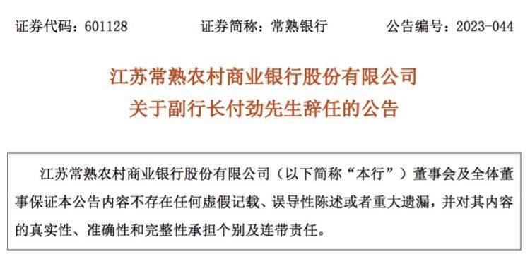 公告显示,因工作调整,付劲向本行董事会提出辞去本行副行长职务。