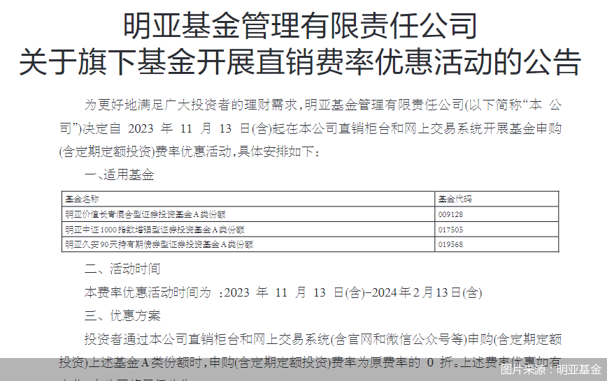 具体来看,投资者通过上述提及渠道申购明亚价值长青混合A、明亚中证1000指数增强A、明亚久安90天持有期债券A时,申购(含定期定额投资)费率为原费率的0折。优惠活动自2023年11月13日起至2024年2月13日止。