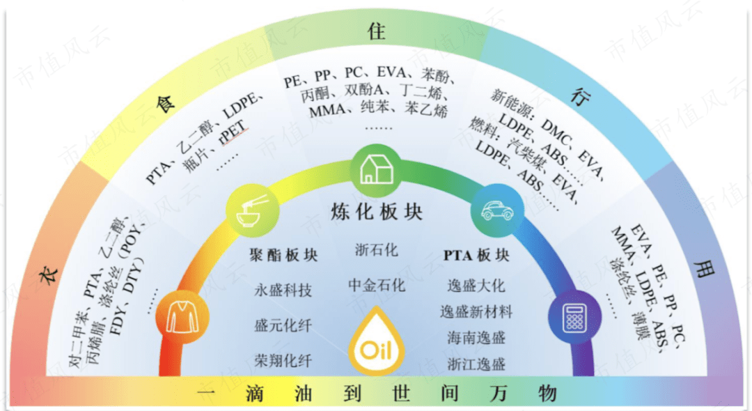 荣盛石化的产品布局从从炼化、芳烃、烯烃到下游的精对苯事甲酸(PTA)、乙事醇(MEG)及聚酯(PET,含瓶片、薄膜)、涤纶丝(POY、FDY、DTY)完整产业链。