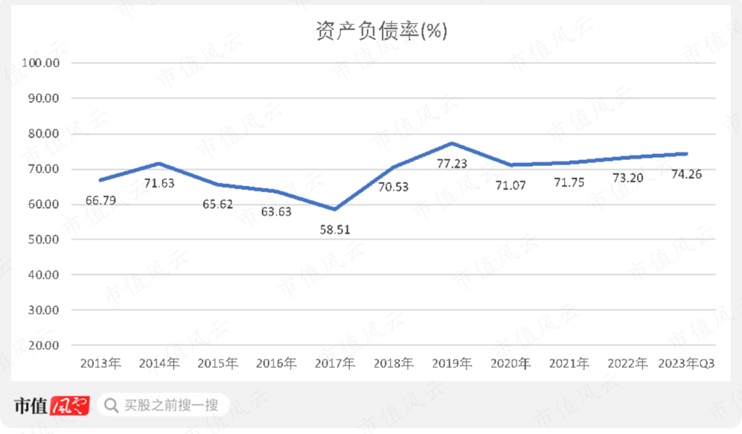 所以荣盛石化的资产负债率是很高的,2023年第三季度为74.26%。