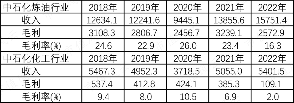 (2)2022年中国石化的炼油收入为15751亿,毛利率为16.3%;化工收入为5401亿,毛利率为2%;炼油+化工收入合计21152亿;