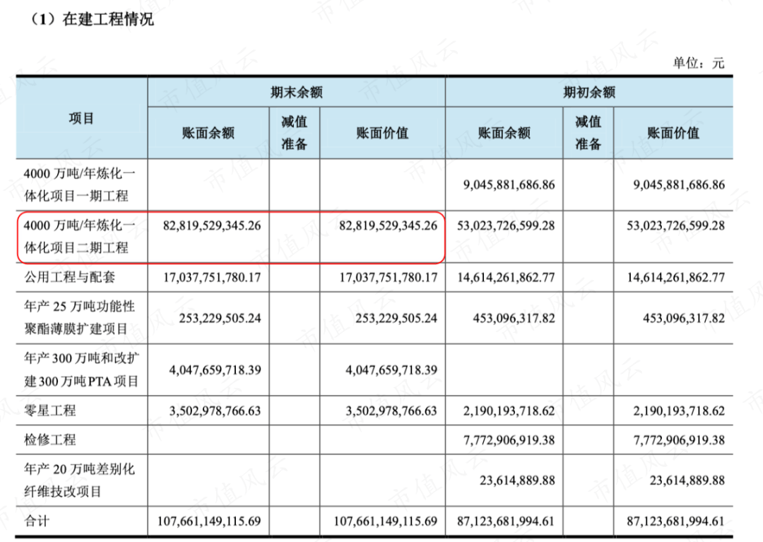 2021年高达上千亿的在建工程中,主要是828亿的浙石化二期工程(4000万/吨/年)。