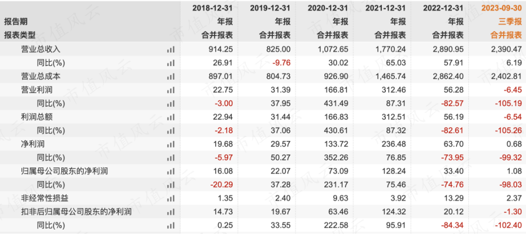 由于石化行业受到上游原油价格和下游需求的影响,利润波动很大,2022年以来荣盛石化面对的是原油价格高位和下游需求低迷的两头挤压,2023年前三季度扣非净利润甚至出现亏损。