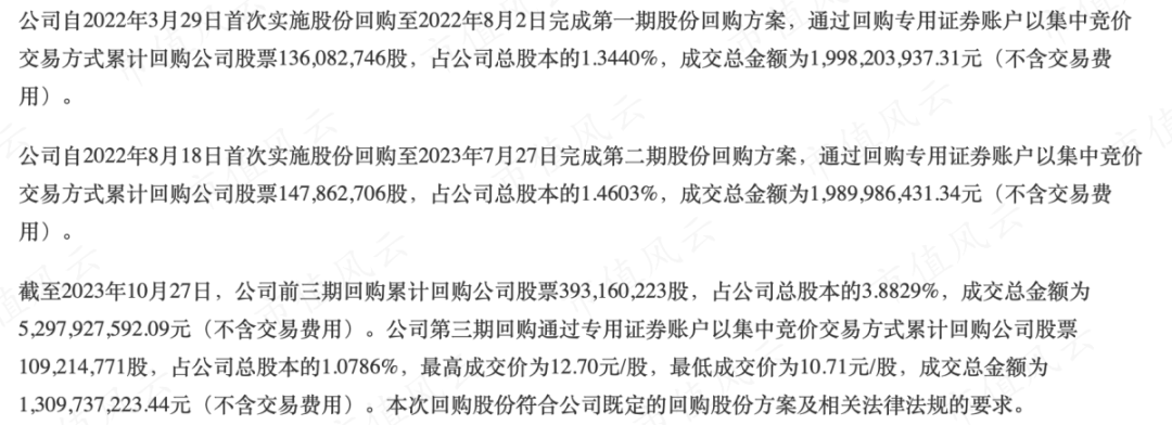 2022年回购近40亿,2023年又继续回购了13个亿,两年累计近53亿。
