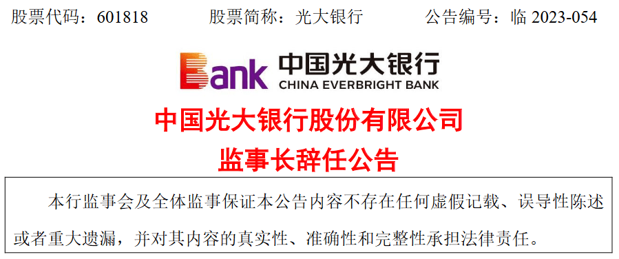11月13日,光大银行发布公告称,因退休原因,该行监事长卢鸿当日向该行监事会提交辞呈,辞去监事长、股东监事及监事会提名委员会委员职务。