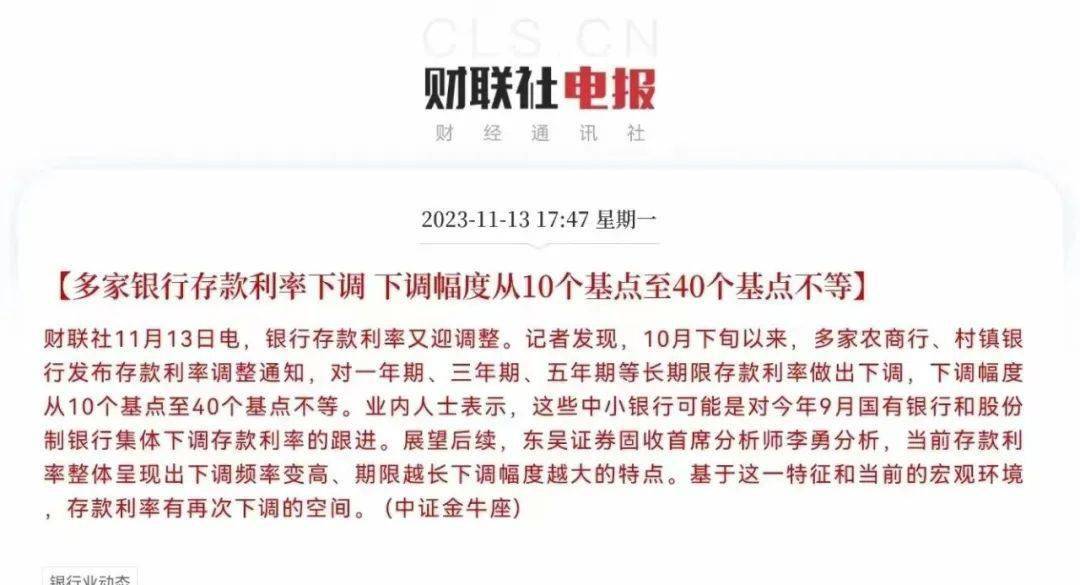 就在傍晚的时候,财联社记者发现10月下旬,多家农商行、村镇银行发布存款利率调整通知,对一年期、三年期、五年期等长期限存款利率做出下调,下调幅度从10个基点至40个基点不等。