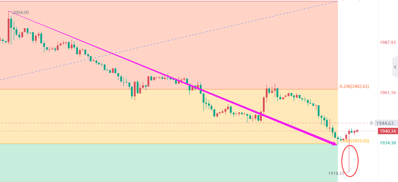黄金操作建议:上方触及1945不破,空单进场,损5个点,目标看下方1918;下方触及1920跌势没有延续反手做多(这个后面会实时解析)