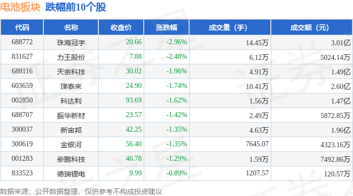 北向资金方面,当日电池板块北向资金持股市值为1105.58亿元,减持3.82亿元。其中增持最多的是珠海冠宇,增持了0.38亿元。减持持最多的是亿纬锂能,减持了1.05亿元。电池板块北向资金持股变动明细见下表: