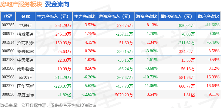 从资金流向上来看,当日房地产服务板块主力资金净流出1.79亿元,游资资金净流入4214.89万元,散户资金净流入1.37亿元。房地产服务板块个股资金流向见下表: