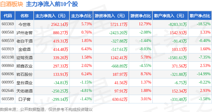 从资金流向上来看,当日白酒板块主力资金净流出6.62亿元,游资资金净流入3.98亿元,散户资金净流入2.64亿元。白酒板块个股资金流向见下表:
