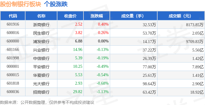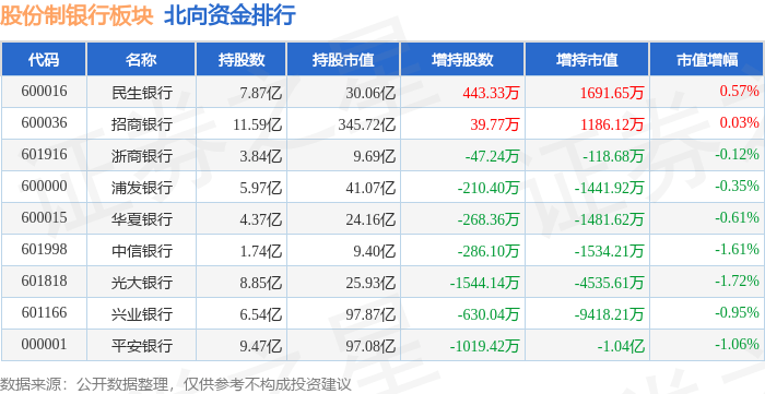 北向资金方面,当日股份制银行板块北向资金持股市值为680.98亿元,减持2.61亿元。其中增持最多的是民生银行,增持了0.17亿元。减持持最多的是平安银行,减持了1.04亿元。股份制银行板块北向资金持股变动明细见下表: