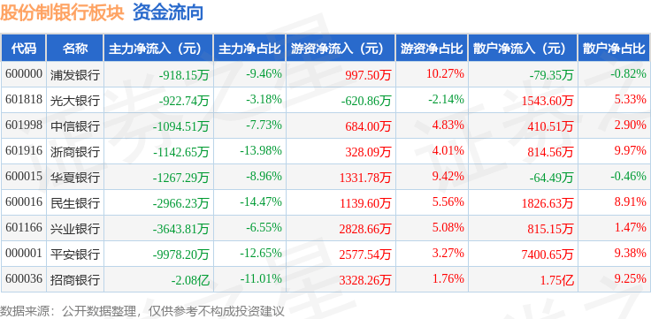从资金流向上来看,当日股份制银行板块主力资金净流出4.28亿元,游资资金净流入1.26亿元,散户资金净流入3.02亿元。股份制银行板块个股资金流向见下表: