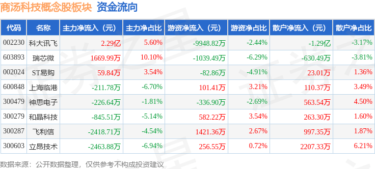 从资金流向上来看,当日商汤科技概念股板块主力资金净流入1.84亿元,游资资金净流出9046.53万元,散户资金净流出9395.15万元。商汤科技概念股板块个股资金流向见下表: