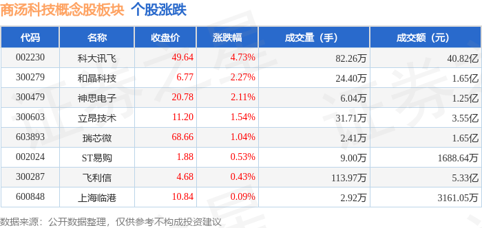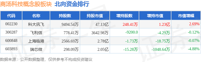 北向资金方面,当日商汤科技概念股板块北向资金持股市值为52.32亿元,增持1.13亿元。其中增持最多的是科大讯飞,增持了1.23亿元。减持持最多的是瑞芯微,减持了0.1亿元。商汤科技概念股板块北向资金持股变动明细见下表: