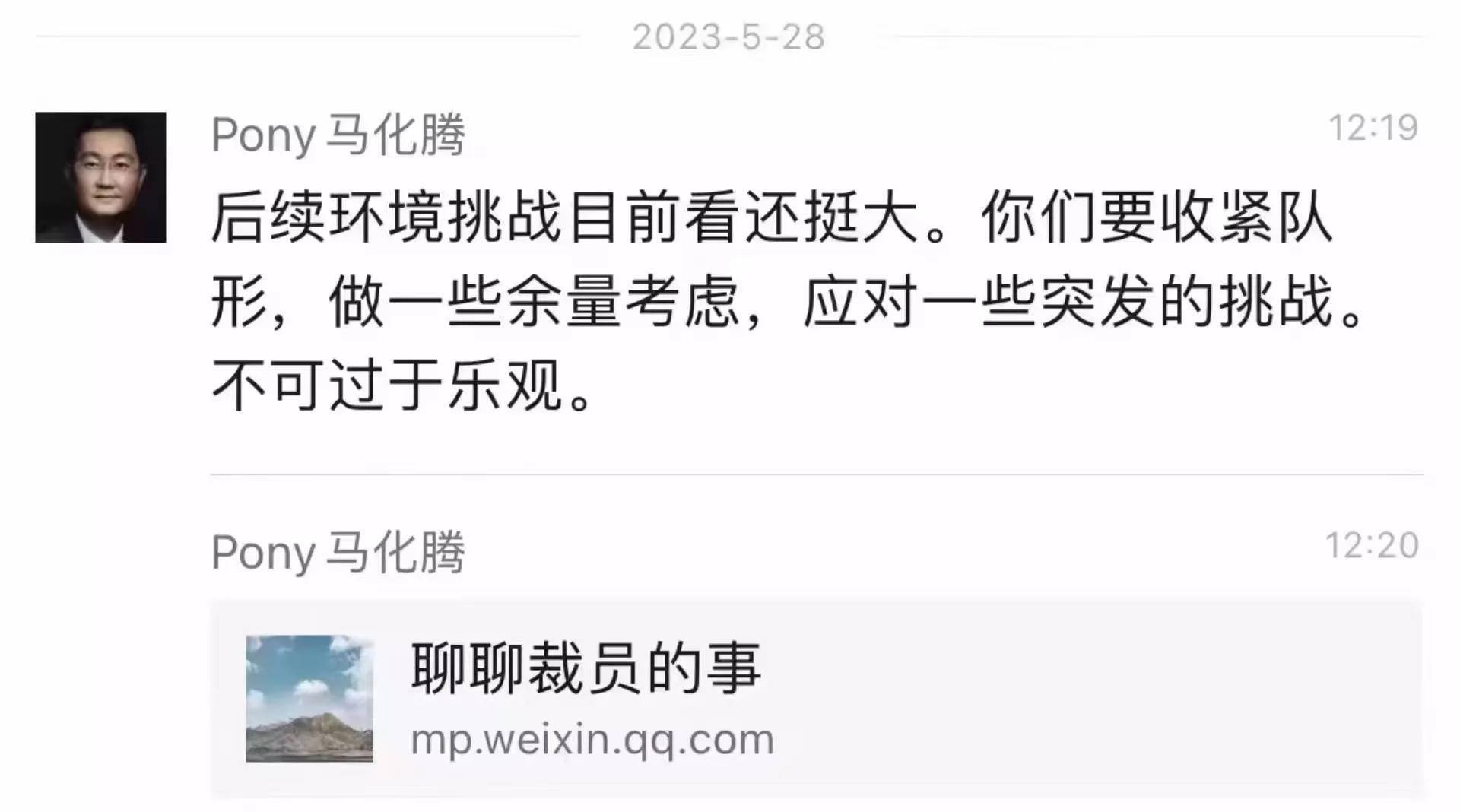 6月2日消息,一张网传马化腾谈及“裁员”文章的聊天记录刷屏,聊天中,马化腾引用一篇名为《聊聊裁员的事》的文章,并表示:后续环境挑战目前看还挺大。你们要收紧队形,做一些余量考虑,应对一些突发的挑战不可过于乐观。