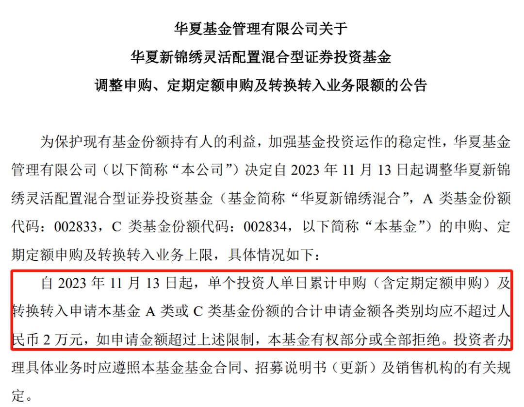 11月13日,华夏基金发布公告称,为保护现有基金份额持有人的利益,加强基金投资运作的稳定性,决定自2023年11月13日起调整华夏新锦绣灵活配置混合型证券投资基金的申购、定期定额申购及转换转入业务上限。
