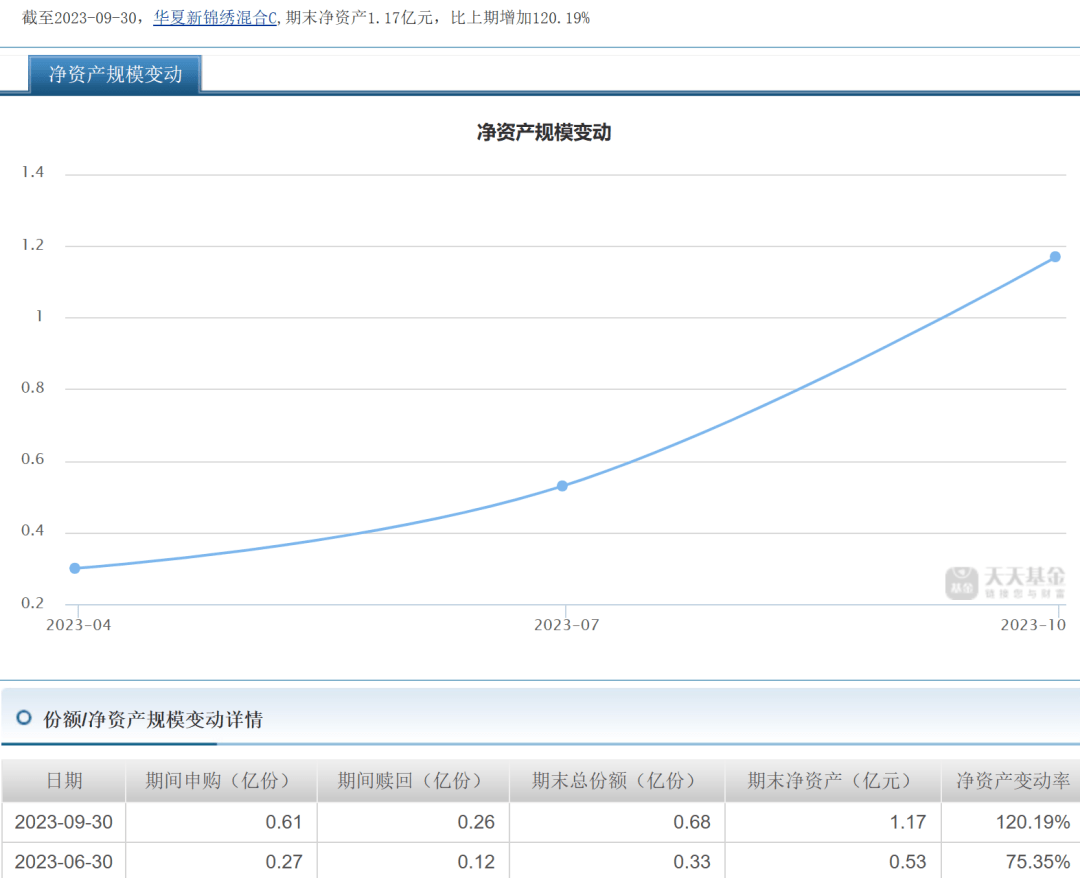资料显示,华夏新锦绣混合基金成立于2016年8月24日,目前的基金经理是张城源。截至今年三季度末其A份额和C份额合计规模为2.02亿元,基金君留意到,该基金C份额的净资产在今年二季度、三季度分别增长超75%、120%。