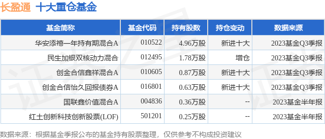 根据2023基金Q3季报公募基金重仓股数据,重仓该股的公募基金共4家,其中持有数量最多的公募基金为华安添禧一年持有期混合A。华安添禧一年持有期混合A目前规模为2.29亿元,最新净值0.9662(11月10日),较上一交易日上涨0.0%,近一年下跌3.55%。该公募基金现任基金经理为舒灏 周益鸣。舒灏在任的基金产品包括:华安新机遇灵活配置混合A,管理时间为2018年11月12日至今,期间收益率为33.68%;华安大安全主题混合A,管理时间为2018年12月3日至今,期间收益率为150.12%;华安鼎安优选一年持有混合A,管理时间为2022年6月2日至今,期间收益率为-9.69%。周益鸣在任的基金产品包括:华安新优选灵活配置混合A,管理时间为2019年12月10日至今,期间收益率为24.51%;华安添瑞6个月混合A,管理时间为2020年6月22日至今,期间收益率为10.59%;华安添福18个月混合A,管理时间为2021年1月5日至今,期间收益率为2.16%;华安添利6个月债券A,管理时间为2021年2月5日至今,期间收益率为0.93%。