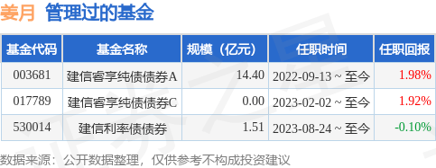 姜月女士:中国国籍,硕士,2013年7月至2014年11月在泰康资产管理有限责任公司担任权益投资部股票投资支持经理,从事股票投资支持工作;2014年12月加入建信基金,历为交易部交易员、固定收益投资部投资助理、基金经理助理、投资经理等职务。2022年9月13日起担任建信睿享纯债债券型证券投资基金基金经理。2023年08月24日起担任建信利率债债券型证券投资基金基金经理。