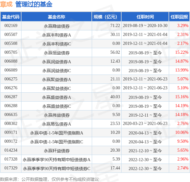 章成先生:中国,CFA,国立清华大学金融学硕士,曾就职于广发银行股份有限公司金融市场部利率及衍生品交易处、国联安基金管理有限公司固定收益部,现任永赢基金管理有限公司固定收益投资部基金经理。2019年8月19日至2020年10月30日担任永赢稳益债券型证券投资基金基金经理。2019年8月19日担任永赢恒益债券型证券投资基金、永赢润益债券型证券投资基金、永赢盛益债券型证券投资基金基金经理。2019年12月11日担任永赢伟益债券型证券投资基金基金经理。2019年12月11日至2021年6月23日担任永赢聚益债券型证券投资基金基金经理。2019年12月11日至2021年1月4日担任永赢丰利债券型证券投资基金基金经理。2020年3月23日至2021年6月23日担任永赢易弘债券型证券投资基金基金经理。2020年4月13日起担任永赢中债-1-5年国开行债券指数证券投资基金基金经理。曾任永赢稳益债券型证券投资基金基金经理。任永赢季季享90天持有期中短债债券型证券投资基金的基金经理。