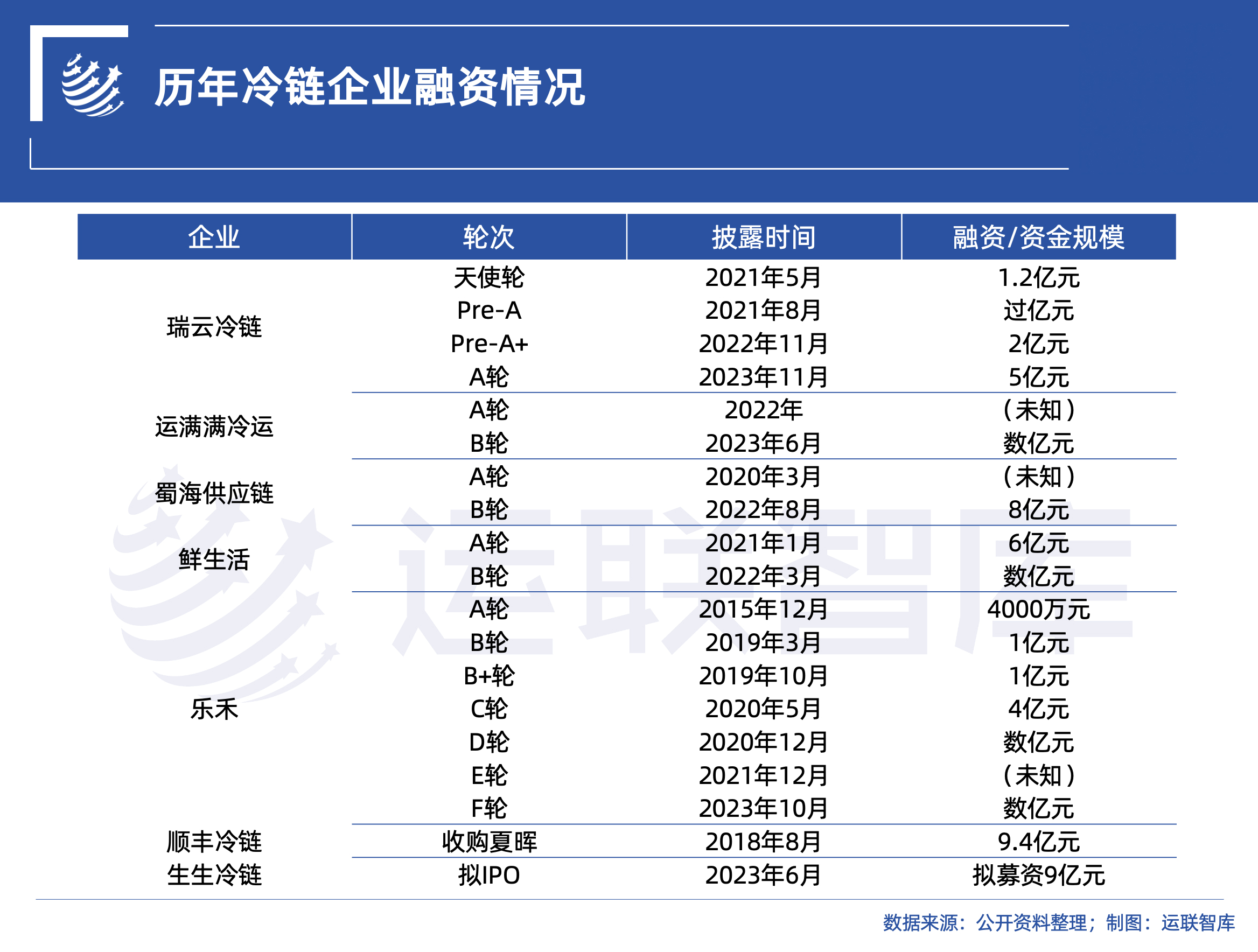 一个明显的感受就是,物流这个大赛道中,冷链成为资本独爱的细分市场。瑞云冷链三年拿到4轮超10亿元的融资,运满满冷运、海底捞旗下蜀海供应链、新希望旗下鲜生活、乐禾等近几年也拿到亿元级别融资,生生冷链则是以60亿元的估值排队上市……