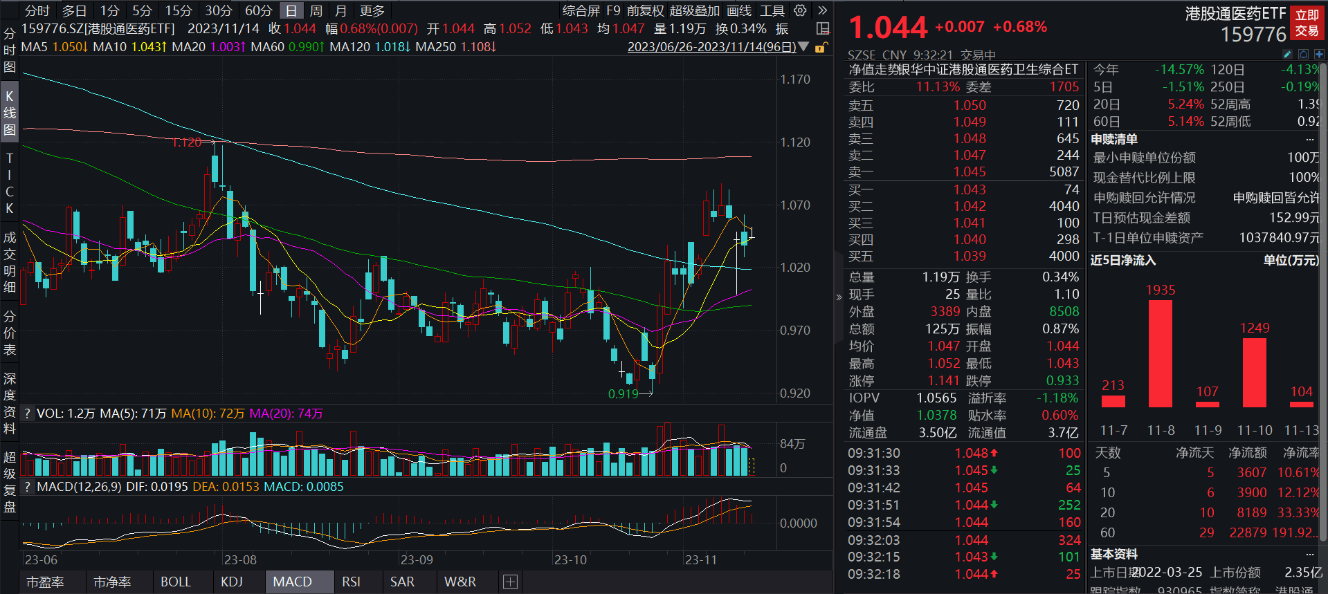截至2023年11月14日9:32,港股通医药ETF(159776)开盘拉升,已涨0.68%,报1.044元,委比超10%,买盘活跃,市场资金持续关注。Wind数据显示,该基金已连续5日获资金净流入。