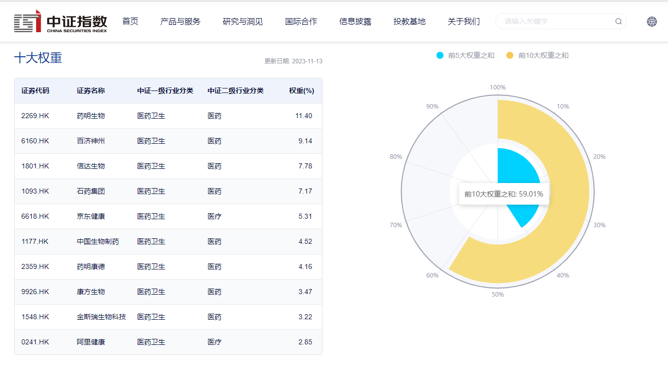 截至2023年11月13日,该指数前十大权重股包括药明生物、百济神州、信达生物、石药集团、京东健康等,前十大权重股比重合计约为59.01%。(数据来源:中证指数公司,指数成份股不代表个股推荐)
