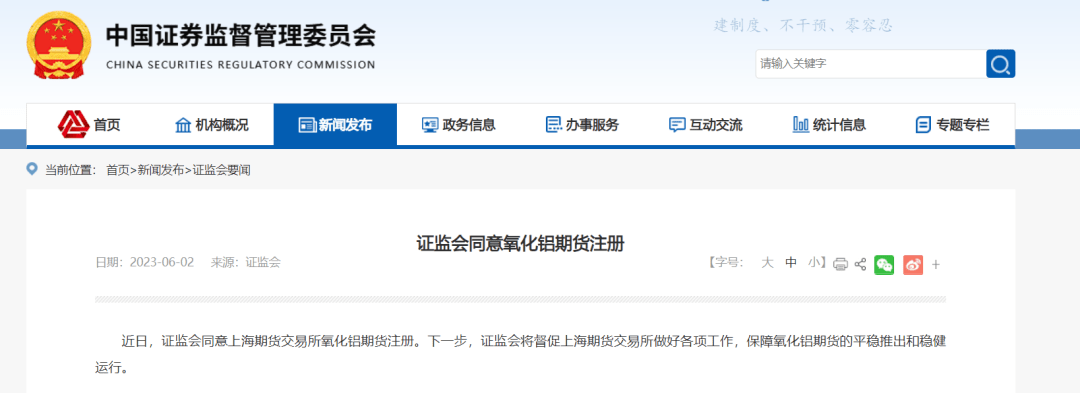 据证监会网站6月2日消息,近日, 证监会同意上海期货交易所(以下简称“上期所”)氧化铝期货注册。证监会表示,下一步将督促上海期货交易所做好各项工作,保障氧化铝期货的平稳推出和稳健运行。