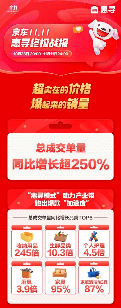 伴随在京东11.11期间快速增长,惠寻将继续锚定“下葫芦”市场,以品质低价好产品服务广大消费者。同时,惠寻也将继续加强供应链能力建设,推动产业带工厂质造升级,打造产业合作的创新发展样板。
