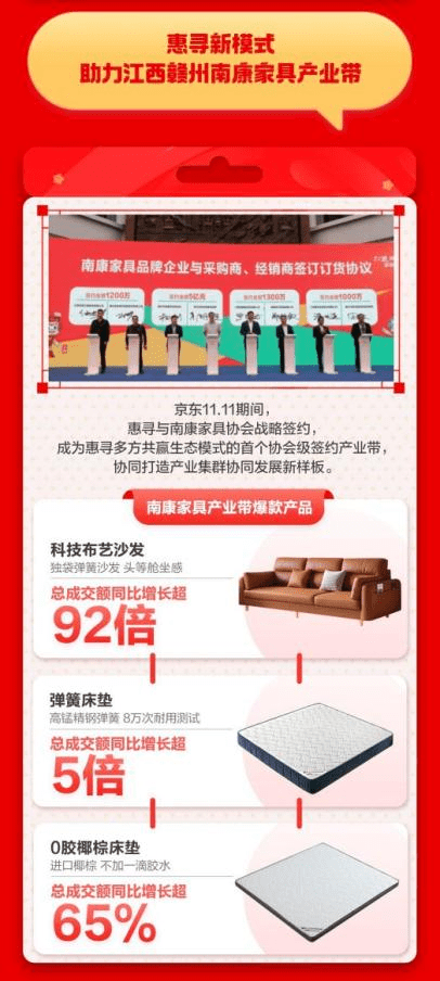 日前,惠寻还与赣州市南康家具协会正式签署了战略合作协议,未来3年内, 预计携手超300家本地优质工厂,以“多方共赢生态模式”助力产业带伙伴快速拓展线上渠道,实现质造升级。