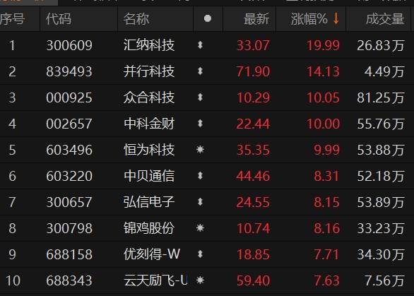 上证报中国证券网讯 11月14日,算力概念股午后持续走高,截至13时47分,众合科技拉升封板,汇纳科技、中科金财、恒为科技此前涨停,弘信电子、中贝通信等多股涨超7%。