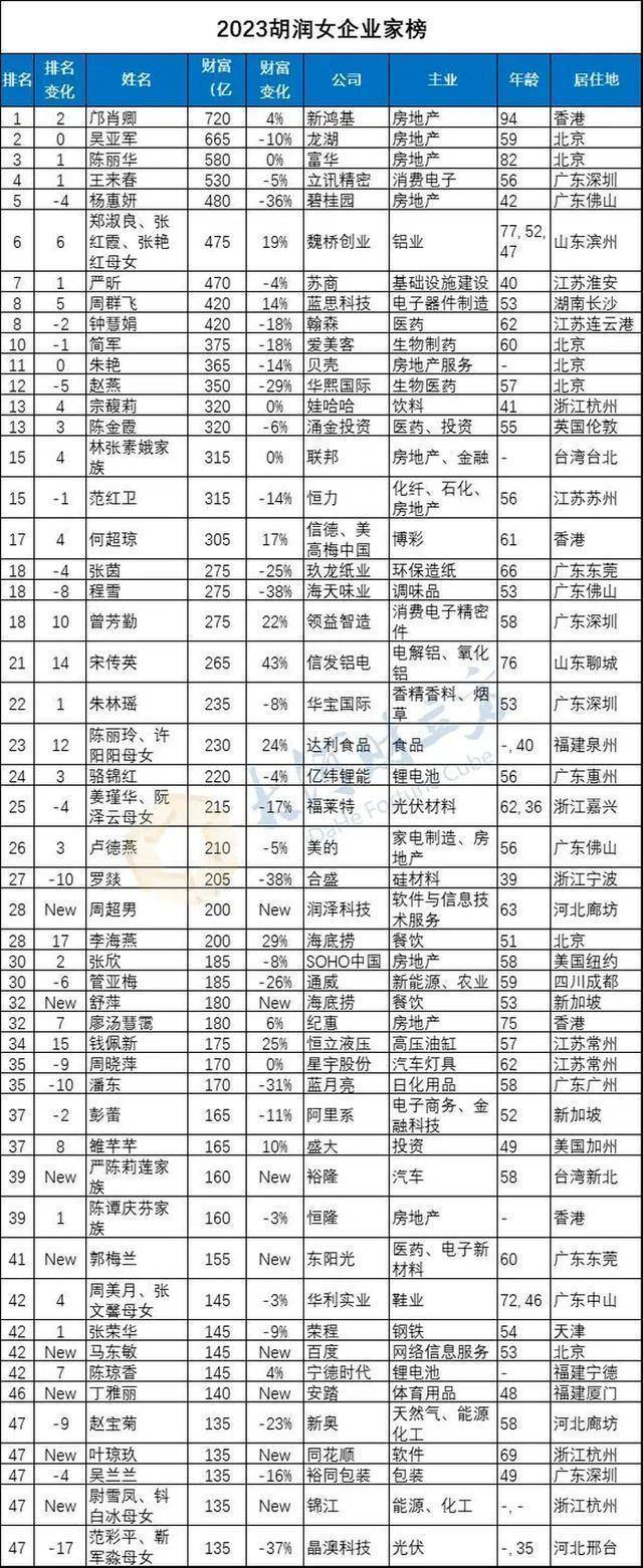 11月14日,胡润研究院发布《2023红颜会·胡润女企业家榜》显示,新鸿基创办人郭得胜的夫人邝肖卿,以720亿元财富首次成为中国女首富;龙湖吴亚军以665亿元财富,蝉联中国白手起家女首富。