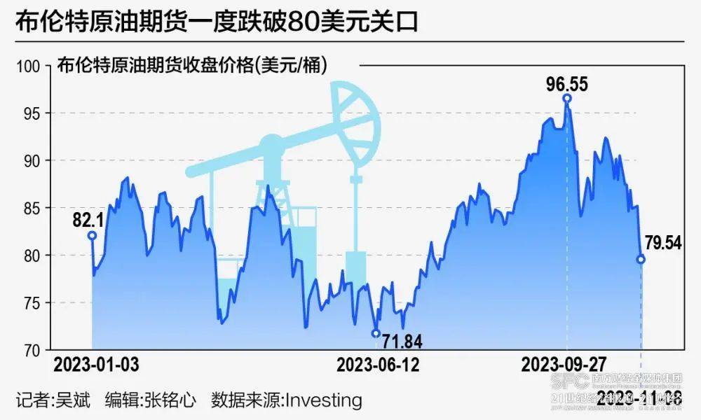 11月10日,布伦特原油期货徘徊在80美元/桶附近,WTI原油期货在76美元/桶附近。
