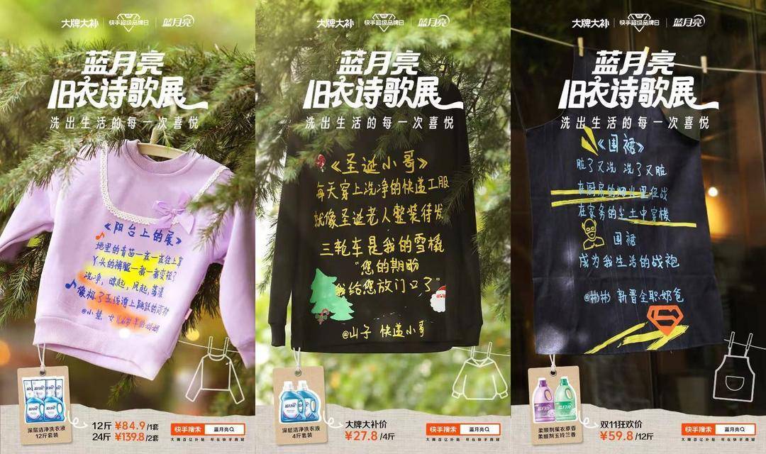 围绕蓝月亮超品日主推爆品薰衣草深层洁净洗衣液,打造以「洗出生活的每一次喜悦」为主题的「旧衣诗歌展」。在活动前期,快手超品日和蓝月亮向用户征集「想丢掉的旧衣服」,用蓝月亮洗衣液洗净后,成为了生活诗歌的载体。快递小哥、新手宝妈、全职奶爸等身份各异的人,在洁净的旧衣上用诗歌的形式抒写生活中的“洗”悦小事。写满诗歌的旧衣,被晾晒在年轻人citywalk新地标——朗园Vintage中,走过这里的人们,抬头就可以看见这些生活细节里的幸福感,感受来自平凡生活的诗意。#藏在北京胡同里的诗词歌赋#、#北京用旧衣服办诗歌展 登上微博同城榜。