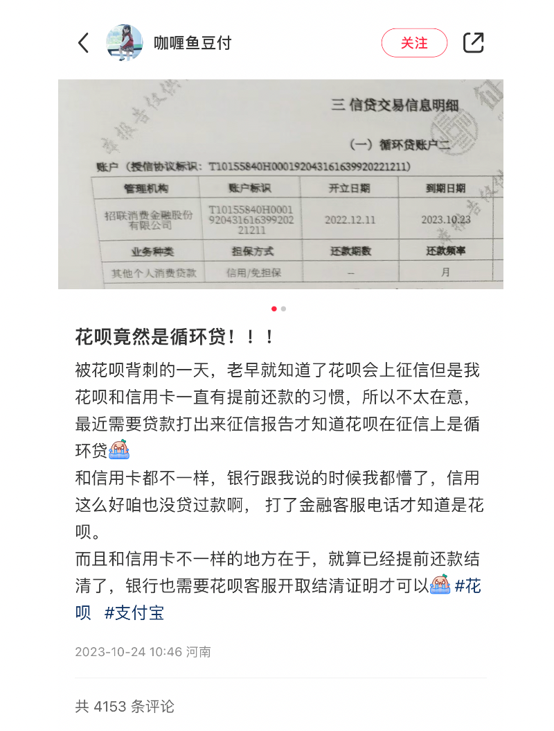 无独有偶,10月24日小红书上一位“咖喱鱼豆付”的网友发帖称,自己在申请房贷时,打印征信才知道,花呗是循环贷,而当地银行要求她打印“结清证明”。
