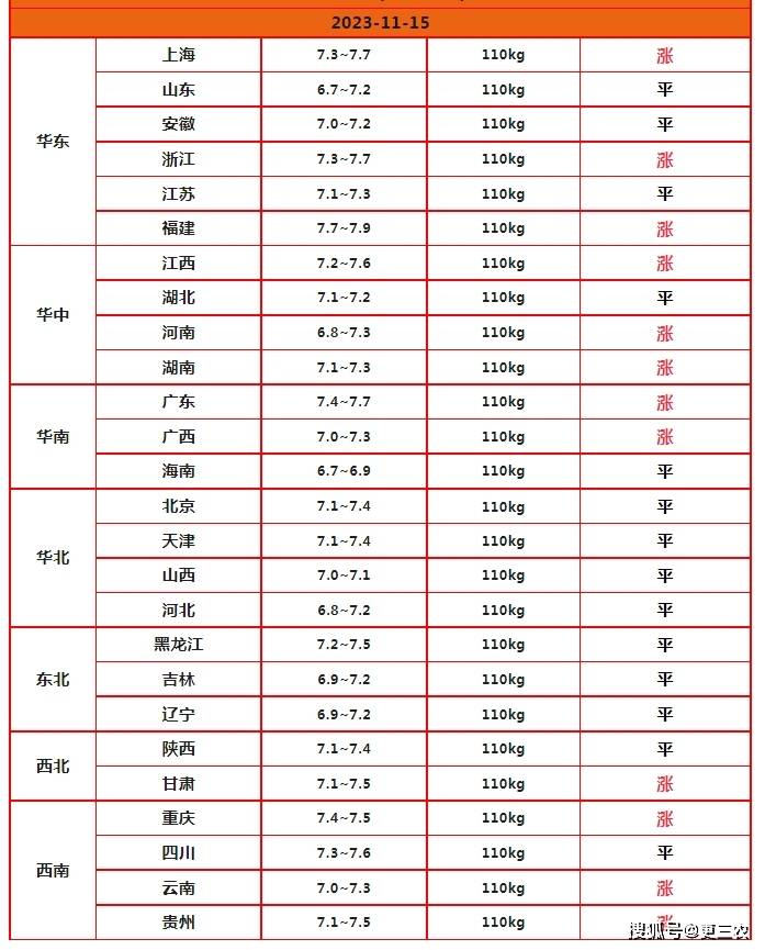 从分区市场反馈分析,在全国7个生猪产区,华北、东北以及西北地区,猪价普遍企稳,黑吉辽地区生猪出栏报价盘整6.9~7.5元/斤,而在山西以及河北地区猪价企稳6.8~7.2元/斤。但是,在西南、华东、华中以及华南地区,猪价呈现普遍上涨的态势,屠企涨价幅度在0.05~0.1元/斤左右,其中,四川报价7.3~7.6元,浙江报价7.3~7.7元,福建报价7.7~7.9元,河南报价6.8~7.3元/斤,广东市场报价7.4~7.7元/斤!