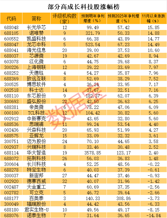 数据宝梳理出TMT板块、医药及电力设备行业中的高成长股,其中不乏两路主力资金均大幅增持的个股。根据机构一致预测,上述板块中,明后两年净利增速均超30%的个股中,有34只个股11月以来同时获得杠杠资金和北上资金增持。
