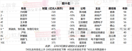 新鸿基94岁的邝肖卿以720亿元财富首次成为中国女首富,比去年上升2位,主要受益于今年港币汇率的上涨及公司分红。龙湖59岁的吴亚军财富下降70亿,以665亿元保持第二,蝉联中国白手起家女首富。富华82岁的陈丽华以580亿元财富排名第三,比去年上升1位。去年女首富杨惠妍财富缩水270亿,以480亿位列第五。