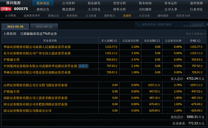 但从盘面看到,在淮河能源发布相关公告前,淮河能源的股价于5月30日毫无征兆地出现涨停,当天公司并无任何公告。龙虎榜显示,当天华泰证券成都人民南路营业部、东方证券广州宝岗大道营业部打板最为积极,两者的买入金额均超过了千万级别。排在买入额榜单第三的事“沪股通专用”席位,第四则是另一个成都席位:银河证券成都科华北路营业部。未知5月30日的涨停,是否与6月1日晚间披露的重大资产重组消息有关。