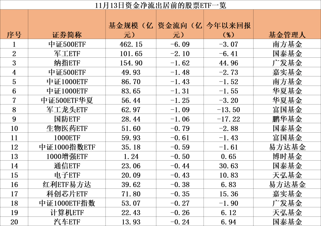 从资金净流出排行看,11月14日,资金净流出超1亿元的股票ETF中,中证500ETF、中证1000ETF占比近六成,此外,纳指ETF以及三只和军工、国防相关ETF产品当日资金净流出居前。