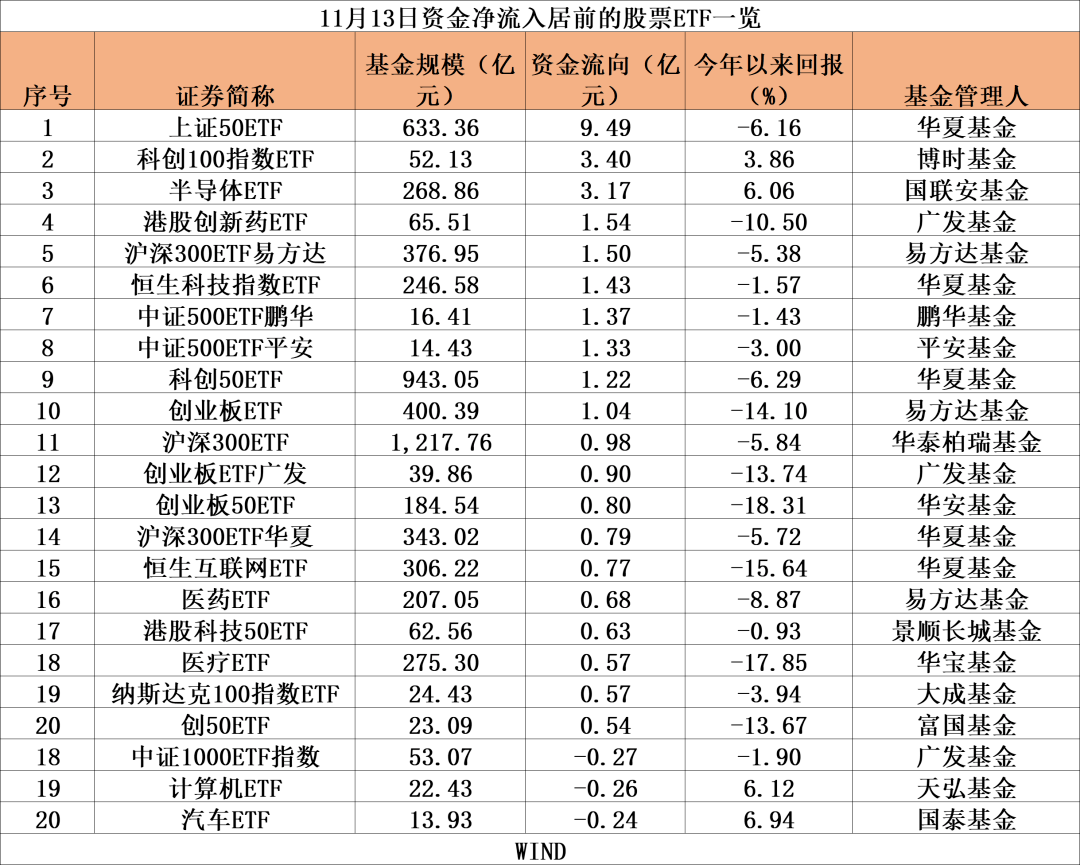 WIND数据显示,截至11月14日,全市场802只股票ETF(统计股票ETF和跨境ETF)管理规模超1.67万亿元。昨日,大盘全天高开后窄幅震荡,三大指数均小幅上涨,截至收盘,沪指涨0.25%,深成指涨0.1%,创业板指涨0.2%。板块方面,华为异腾、鸿蒙概念、国防军工、数据要素等板块涨幅居前,生物疫苗、医药商业、证券、减肥药等板块跌幅居前。在这样的行情中,沪深两市股票型ETF合计资金仍净流入19.14亿元。
