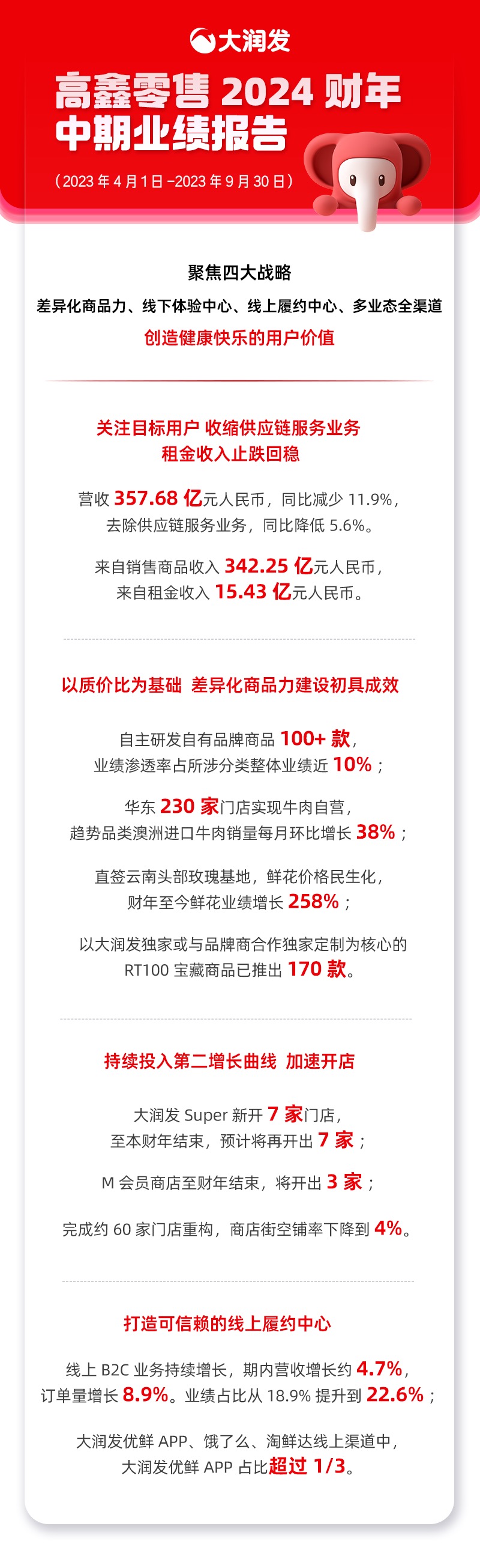 11月14日,高鑫零售发布截至9月30日的2024财年中期业绩报告,营收达357.68亿元,归母净利润-3.78亿元,毛利率为24.9%,与去年同期持平。受益于数字化效率的提升以及店仓一体化能力的优化迭代,线上客流和业绩双增长,线上B2C营收增长4.7%。
