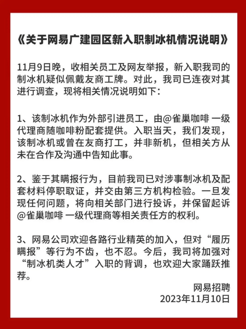 此外,11月10日,网易招聘账号发布情况说明称,雀巢咖啡及其代理商在未提前告知情况下,向网易提供二手制冰机,对此类行为网易不齿、也不忍。鉴于其瞒报行为,目前公司已对涉事制冰机及配套材料停职取证,并交由第三方机构检验。网易表示,一旦发现任何问题,将向相关部门投诉,并保留起诉雀巢咖啡一级代理商的权利。