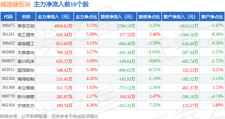 从资金流向上来看,当日减速器板块主力资金净流出1.12亿元,游资资金净流出4174.15万元,散户资金净流入1.53亿元。减速器板块个股资金流向见下表: