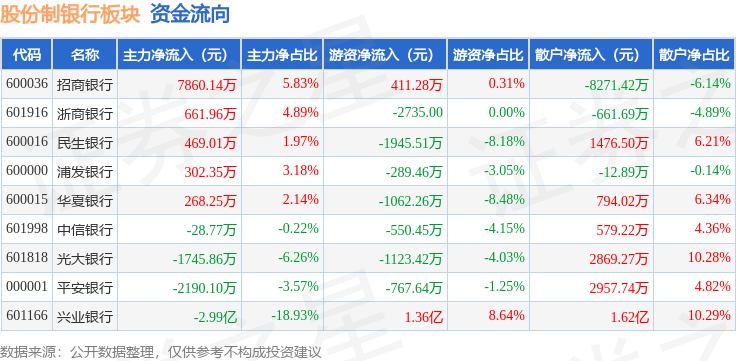 从资金流向上来看,当日股份制银行板块主力资金净流出2.43亿元,游资资金净流入8319.38万元,散户资金净流入1.6亿元。股份制银行板块个股资金流向见下表: