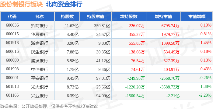 北向资金方面,当日股份制银行板块北向资金持股市值为682.91亿元,减持1.66亿元。其中增持最多的是招商银行,增持了0.68亿元。减持持最多的是兴业银行,减持了2.21亿元。股份制银行板块北向资金持股变动明细见下表: