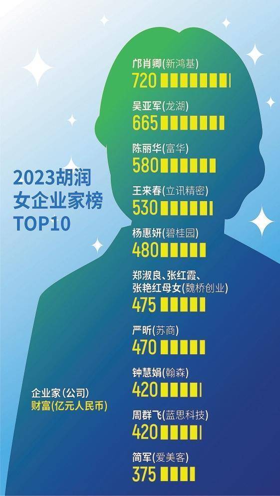 【深圳商报讯】(驻穗记者 张莹)胡润研究院11月14日发布2023女企业家榜单,列出了今年胡润百富榜前50名女企业家。榜单显示,新鸿基创办人郭得胜的夫人邝肖卿以720亿元财富首次成为中国女首富。