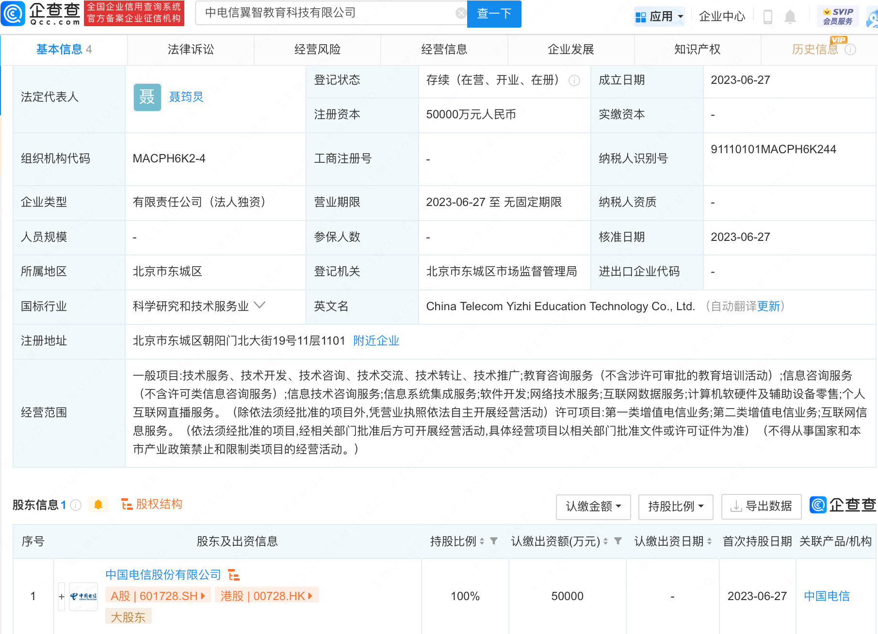企查查APP显示,近日,中电信翼智教育科技有限公司成立,法定代表人为聂筠炅,注册资本5亿元人民币,经营范围包含:个人互联网直播服务;第一类增值电信业务;第二类增值电信业务;互联网信息服务等。企查查股权穿透显示,该公司由中国电信(601728)100%控股。