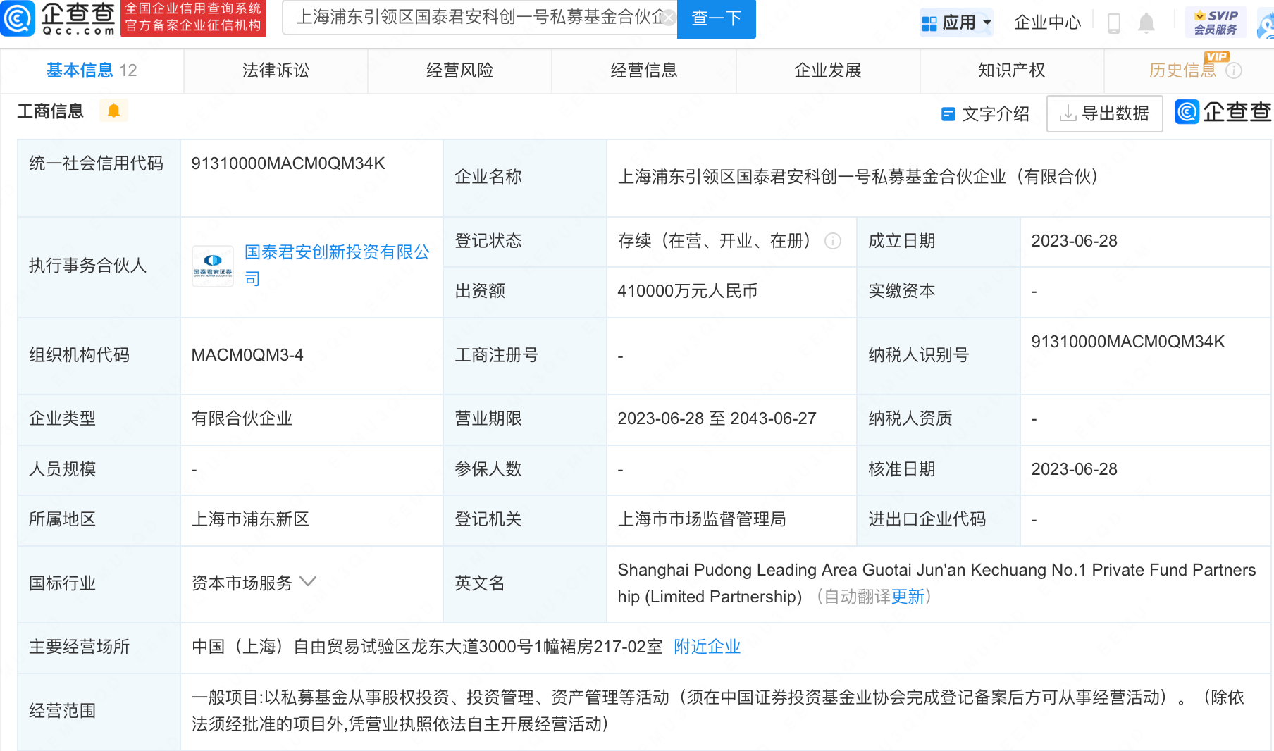 企查查APP显示,近日,上海浦东引领区国泰君安科创一号私募基金合伙企业(有限合伙)成立,执行事务合伙人为国泰君安创新投资有限公司,注册资本41亿元人民币,经营范围包含:以私募基金从事股权投资、投资管理、资产管理等活动。企查查股权穿透显示,该公司由张江高科(600895)、中国太保(601601)、恒生电子(600570)等共同持股。